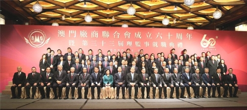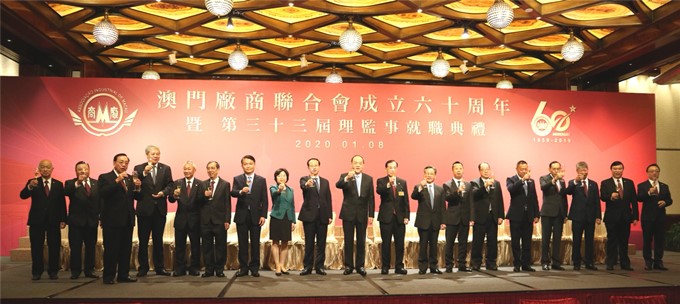1月8日晚,澳门中国企业协会会长、集团董事长傅建国在澳门美高梅宴会厅出席澳门厂商联合会(以下简称“厂商会”)成立60周年会庆暨第三十三届理监事就职典礼,并与澳门特区行政长官贺一诚、澳门中联办主任傅自应、外交公署特派员沈蓓莉、澳门特区立法会主席高开贤、澳门特区政府经济财政司司长李伟农、澳门海关关长黄文忠、澳门中华总商会会长马有礼、厂商会会长崔煜林等共同主礼。崔煜林、李伟农分别致辞。厂商会副会长、中酒公司总经理张健中等出席活动。