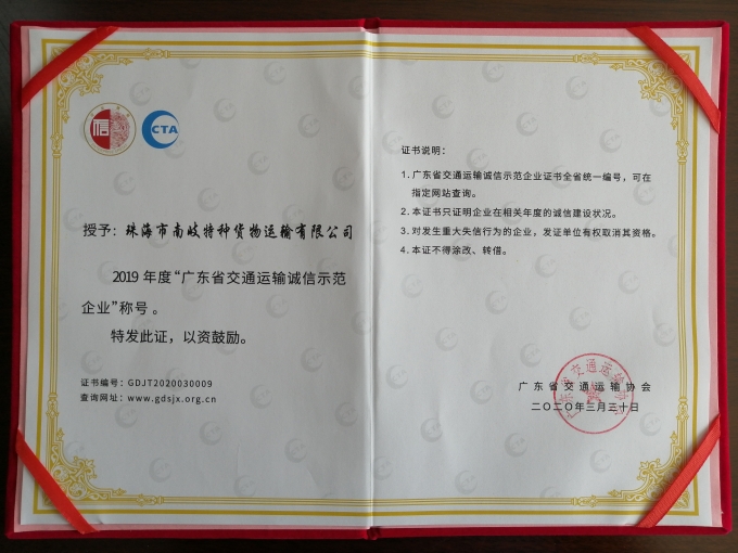 南岐公司此次荣获“2019年度广东省交通运输诚信示范企业”荣誉称号,是在上级单位的严格指导下,经全体员工的不懈努力取得的,该公司以较强诚信守法意识、较高的管理能力和信用水平、完善的管理体系,赢得了公安部、广东省交通厅、交通局、珠海市交警支队、横琴交巡警大队、横琴海关等有关部门和相关澳门客户的良好口碑。经了解,珠海市从事交通运输的企业共311家,其中危险货物运输企业47家,供澳运输企业荣获此次表彰的仅南岐公司一家。