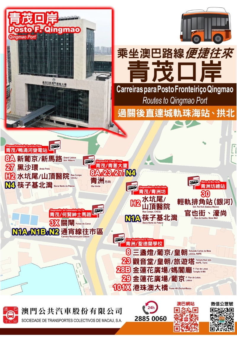 为提升公共巴士服务质素及配合口岸启用后增加的客量需求,经特区政府交通事务局批准,南光澳巴位于青茂口岸周边的巴士路线顺利调整,包括日间路线6条(3X、8A、23、27、30、H2),深宵路线4条(N1A、N1B、N2、N4)。其中3X、8A、N1A、N1B、N2多条巴士路线调整行程或延伸至邻近青茂口岸巴士站点,部分巴士站点并同步更名,增加“青茂”字眼以便识别。