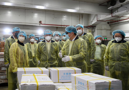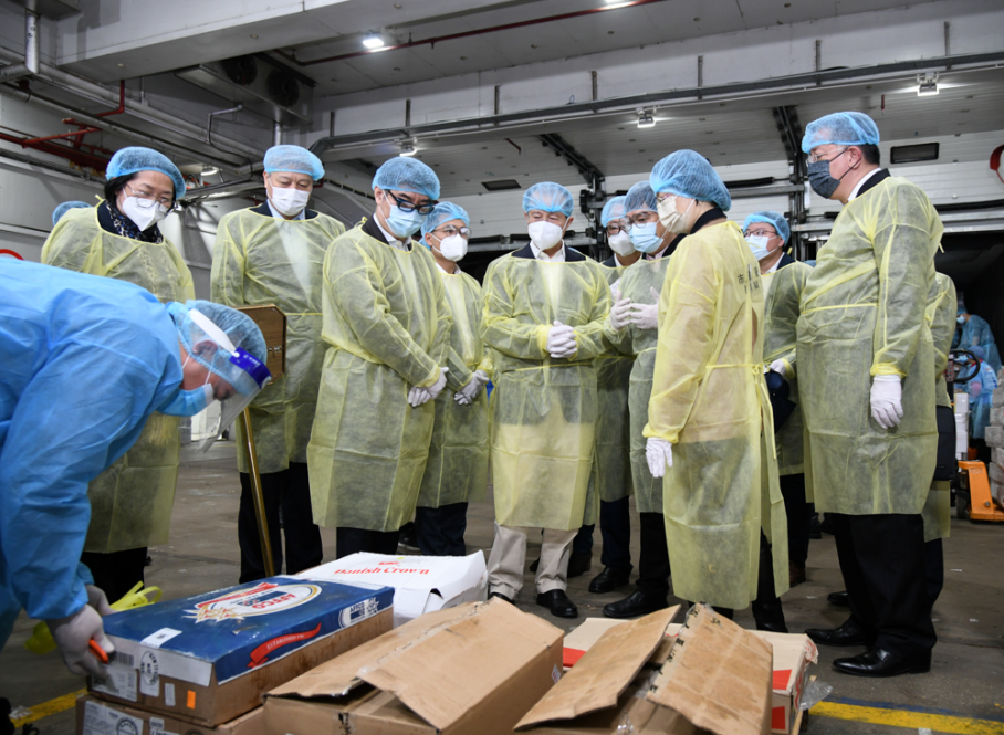 2月18日上午,澳门中联办主任傅自应、副主任严植婵、郑新聪一行到南光集团属下南光物流公司仓码配送部冻仓检查调研,实地考察供澳民生冷冻食品来货渠道、食品安全防疫监测及仓库管理等运行情况,澳门特区政府市政署主席戴祖义、副主席柯岚,澳门中联办办公厅、宣文部、经济部负责人,南光集团董事长傅建国、南光物流公司负责人陪同调研。