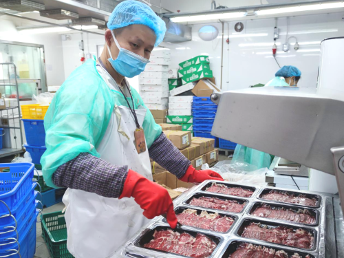 谷丰公司员工佩戴全套防护装备处理冻品