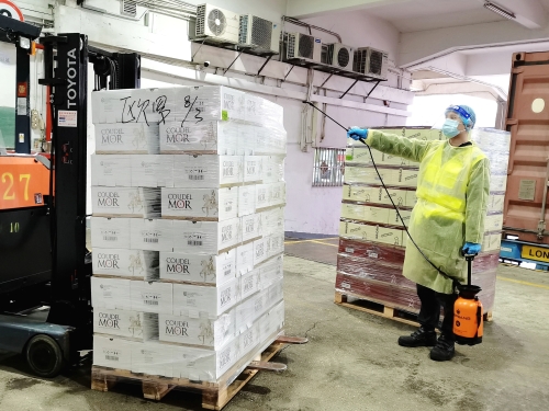 仓码配送部员工对入仓进口货品进行外包装消毒工作