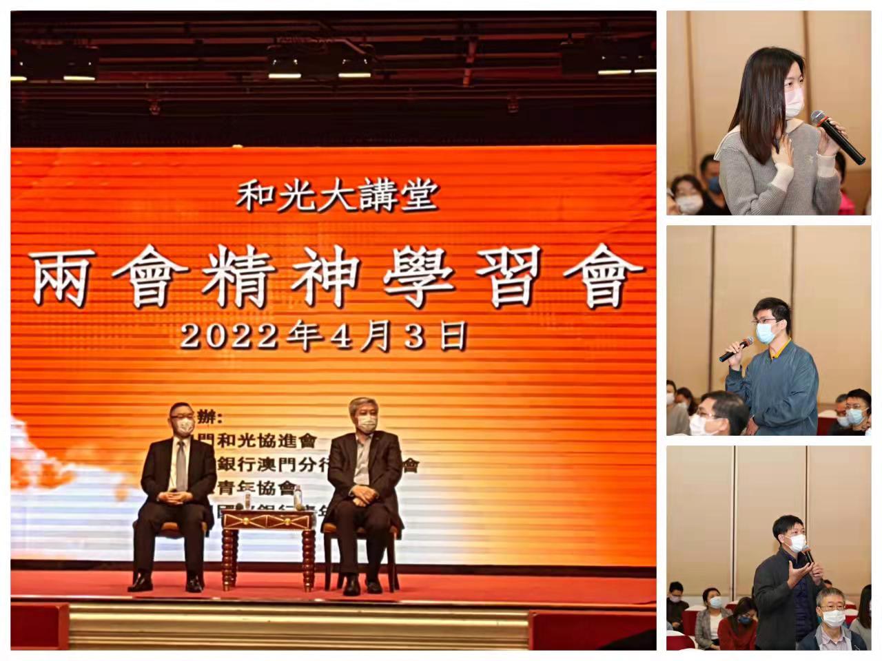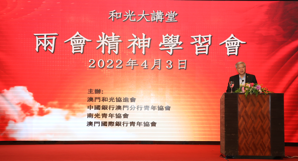 傅建国董事长通过对近几年包括2021年中外经济发展数据对比分析,以及对2022年疫情持续和国际形势复杂多变环境下我国经济工作布局安排的解读,深刻阐明了我国经济发展的韧性和潜力,指出“中国经济一定能顶住压力,必将行稳致远”,坚定了发展信心;从习近平主席亲自谋划部署推动我国全面建成小康社会,持续专注改善民生,今年“两会”也是乘势而上继续把民生改善作为核心议题,深入浅出解读习近平主席以人民为中心的发展思想,坚定了道路自信;从疫情大考下中外防疫理念、策略和成效各方面对比,直观展现了我国制度优势和治理优势,坚定了制度自信;从港澳经济发展的现实出发,深入解读习近平主席关于澳门经济多元发展的重要指示精神,让青年朋友们进一步深刻认识到澳门融入国家发展大局的重要性和紧迫性,坚定适度多元发展的决心;结合十九大及十九届历次全会精神,从我国百年奋斗历程和奋斗目标全局解读“加强中华儿女大团结”的重大意义,引导青年朋友们把握澳门的定位和使命,号召澳门广大青年主动做行政长官和特别行政区政府依法施政的坚定支持者、主动做澳门经济社会繁荣稳定和谐的重要推动者、主动做中华民族伟大复兴的积极参与者!