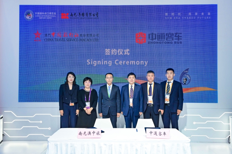 南光集团积极践行“南光+”合作发展理念,充分利用进博会全球合作重要平台作用,11月5日下午和6日上午,集团在进博会展馆举办集中签约活动。本轮签约广泛涉及能源化工、国际贸易、旅游客运、会议展览、城市基建、生物医药、金融债券、新能源汽车等多个领域,签约额达4065万美元,创历届新高,积极助力国家新发展格局构建及澳门经济适度多元发展。集团副总经理宋晓冬,立信会计师事务所首席合伙人、董事长朱建弟,天津中石化悦泰公司总经理朱宗敏,中通客车党委书记、总经理王兴富,狮派(柬埔寨)有限公司(CIPEL)总经理胡肖龙,首创证券副总经理、董事会秘书何峰,上海捷诺总经理夏小凯,东浩兰生集团副总裁周瑾,宁德时代商用副总裁曹治,南光置业董事长邓耀民,南光物流董事长张清,集团战略发展部副总经理范高燕及有关二级公司和参股企业负责人等出席签约仪式。