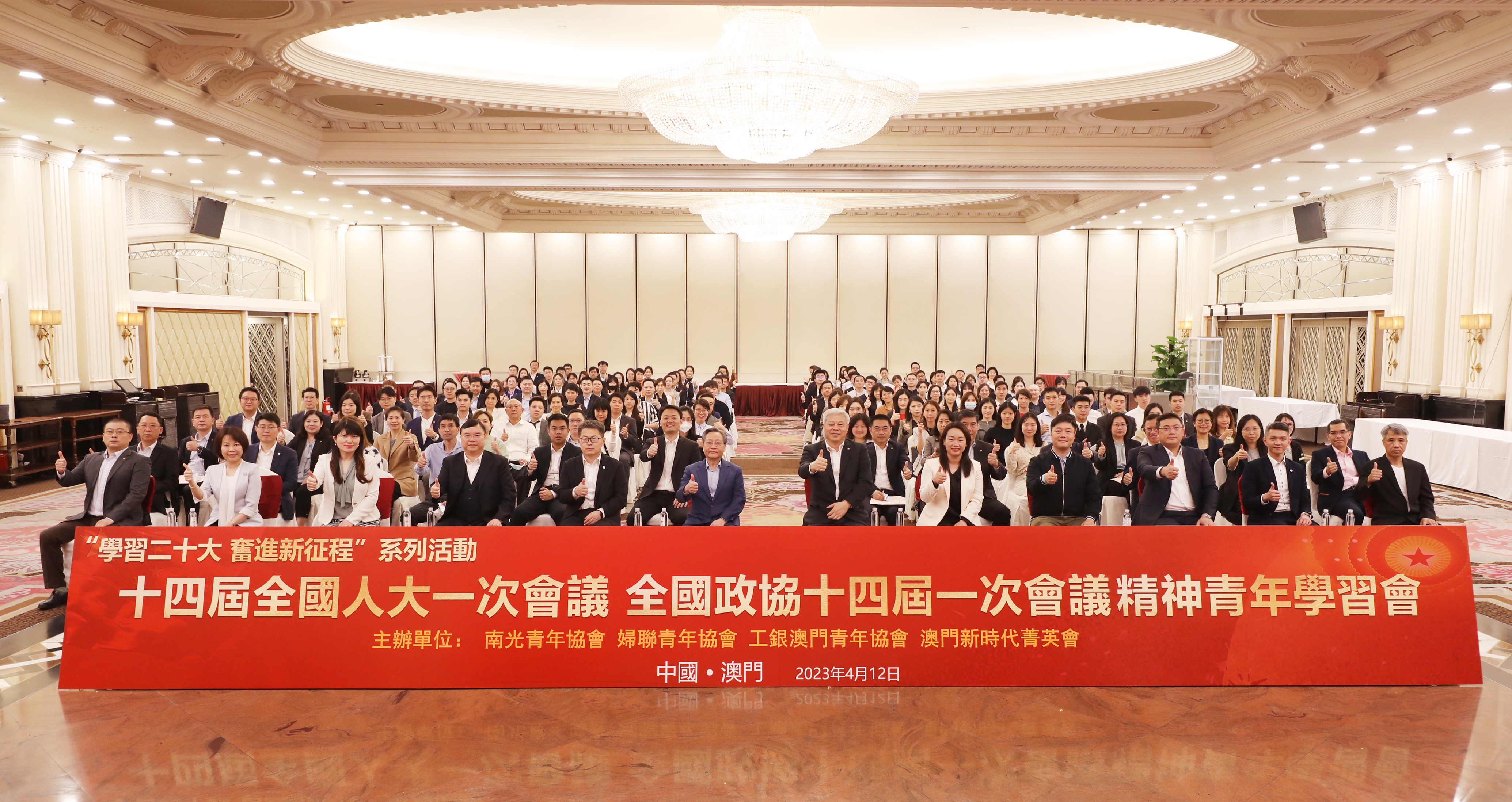 4月12日下午,南光青年协会与澳门妇联青年协会、工银澳门青年协会、澳门新时代菁英会在万豪轩联合主办“两会”精神青年学习会。活动邀请全国人大常委、澳门立法会主席高开贤先生,全国政协委员、澳门中企协会会长、南光集团董事长傅建国先生,全国政协委员、澳门立法会议员黄洁贞女士担任主讲嘉宾。澳门中联办经济部黄圣彪副部长,澳门立法会马耀锋议员,南光青年协会张健中会长、黄舒翔理事长,妇联青年协会吕绮颖会长、欧阳月胜理事长,工银澳门青年协会林毓霞会长、郭凯峰理事长,澳门新时代菁英会奎岳会长以及各社团近150名青年代表出席活动。