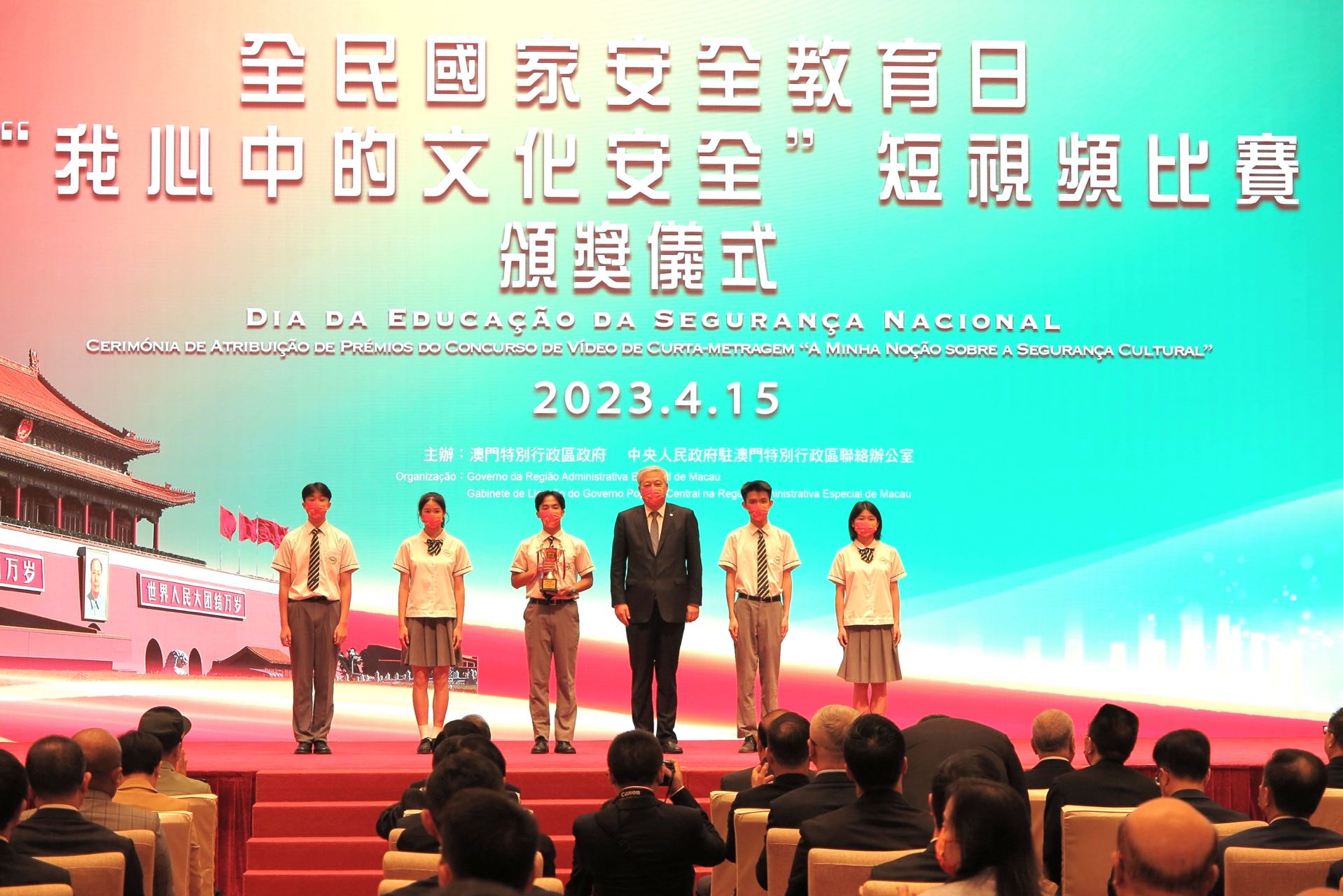 澳门中企协会会长、南光集团董事长傅建国受邀出席国家安全教育展开幕式,并作为颁奖嘉宾为“我心中的的文化安全”短视频比赛活动获奖学生颁奖。