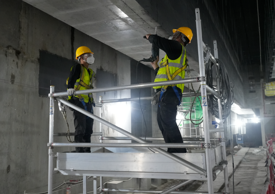澳门轻轨延伸横琴线项目现场工人正在进行月台幕门留孔作业。
