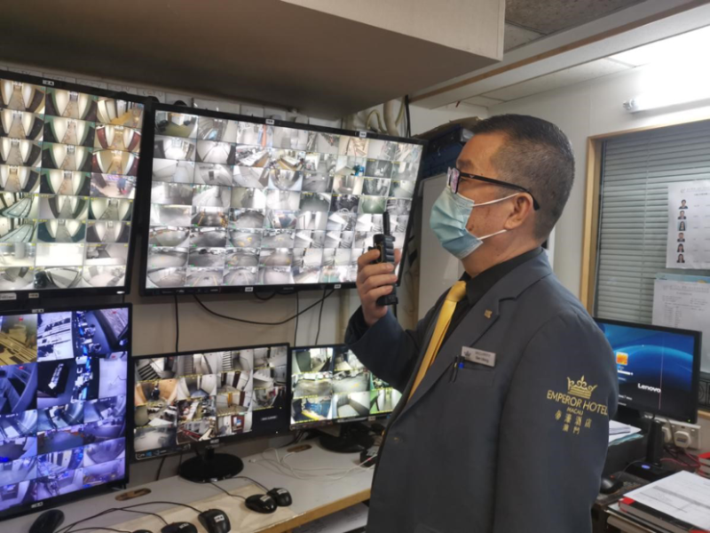 南光澳中旅下属帝濠酒店保安主任紧盯监控屏,观察着酒店各区域并协调做好安保及对客服务。