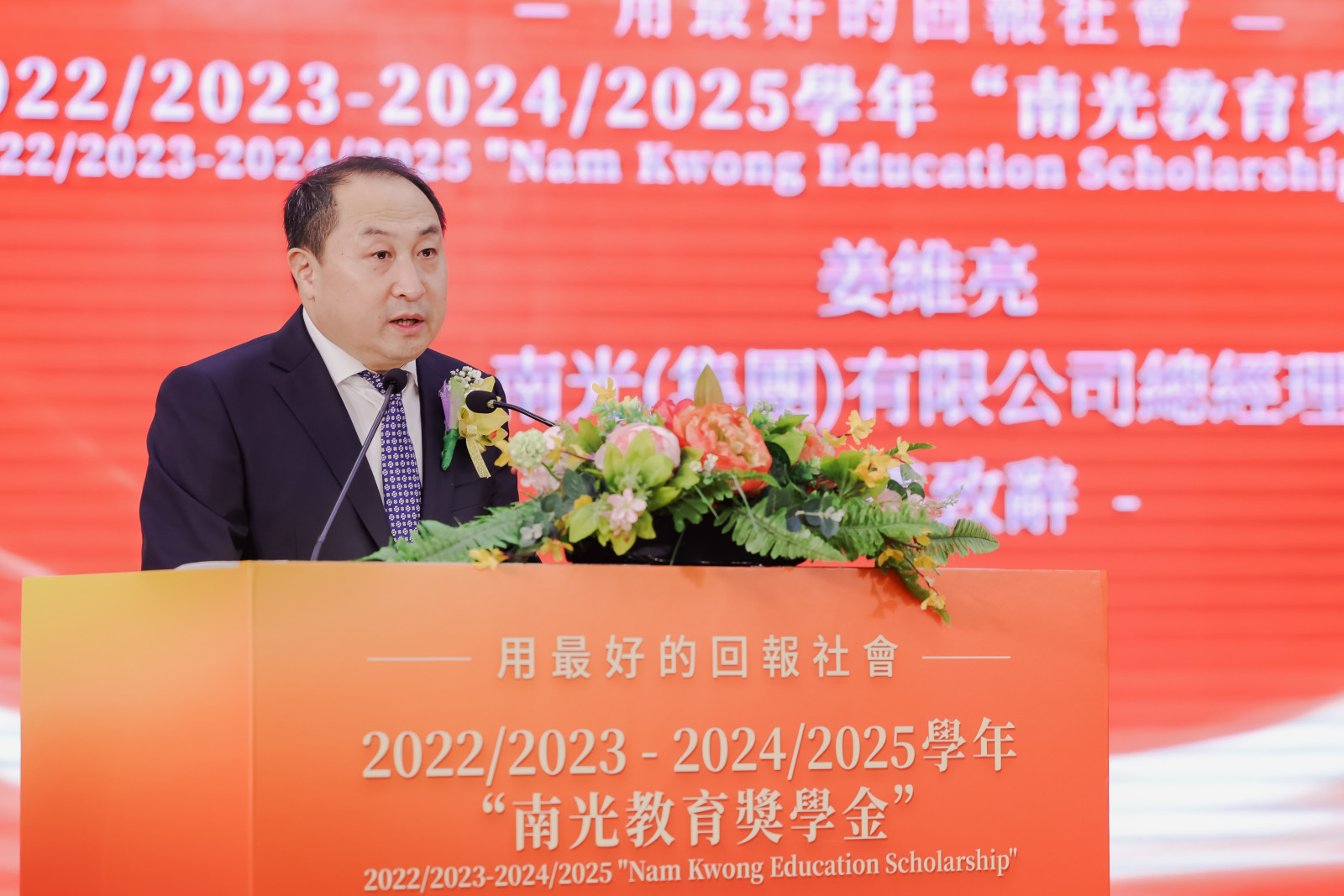 姜维亮总经理代表南光集团致辞。他表示,长期以来,传承爱国爱澳核心价值、服务“一国两制”伟大事业一直是南光人与澳门教育界共同的不变初心、一致的精神追求。集团从2004年开始设立“南光教育奖学金”项目,合作院校逐步扩大到目前的七所院校,项目参与规模和项目影响力不断扩大,到今年是项目实施的第18个年头,为筑牢夯实澳门“一国两制”行稳致远的人才之基作出了自己的贡献。姜维亮表示,此次合作协议的签署,不仅仅是一个为期三年“南光教育奖学金”项目的新一轮启动实施,更是见证一段水乳交融长久情谊的延续,一份历史和社会厚重责任的传承,一次朝着共同新目标勇担历史新使命的重整行装再出发。姜维亮强调,衷心希望未来“南光教育奖学金”项目实施过程中,能够更大程度创造价值,激励澳门广大青少年朋友传承爱国爱澳精神、锤炼过硬本领、担当时代重任;能够更大范围促进合作,当好践行“南光+”发展理念的桥梁纽带;能够更高水平回报社会,为谱写中国式现代化澳门新篇章彰显更多南光担当。也诚挚地向澳门各大院校毕业生发出邀请、敞开怀抱,迎接每一位有志青年、追梦青年,提供多元的发展通道和公平的竞争环境,去磨砺成长、迈向成功!