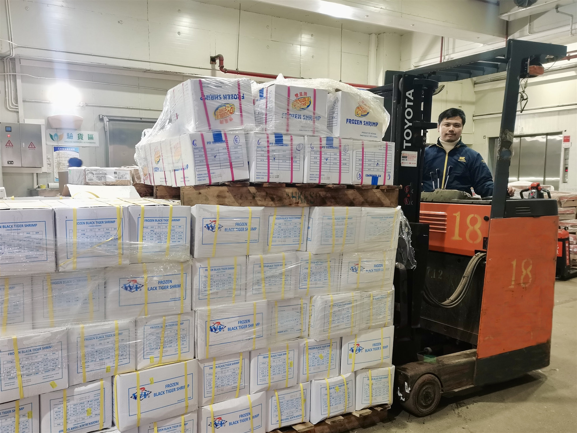 仓码配送部员工节日期间如常忙碌处理出入仓货物,确保食品货物正常流转供应。