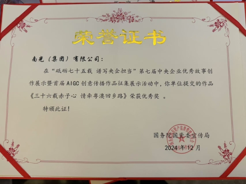 为推动国资央企深入学习贯彻习近平文化思想,学习贯彻好党的二十届三中全会精神,庆祝中华人民共和国成立75周年,全面展现中央企业在中国式现代化新征程上的担当作为,进一步弘扬正能量、唱响主旋律、提振精气神,积极讲好中央企业故事,今年6月,国务院国资委宣传局联合人民网、中国外文局新媒体国际传播中心以“砥砺七十五载谱写央企担当”为主题,组织开展了本届活动。自今年启动以来,共收到各中央企业推荐报送的图文及视频作品2600余件,其中,集团获奖作品《三十六载赤子心情牵粤澳回乡路》通过小切口、大视角,讲述了南光好故事、传递了南光正能量,弘扬了南光精神,树立了良好的企业形象,展现了南光集团长期以来根植澳门、服务澳门的央企担当。