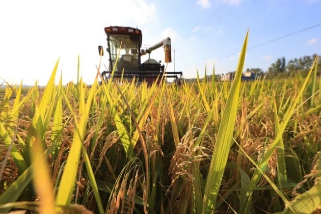 2025年10月16日,在江苏省连云港市赣榆区城头镇中青墩村,种植户驾驶收割机抢收水稻。新华社发(司伟摄)